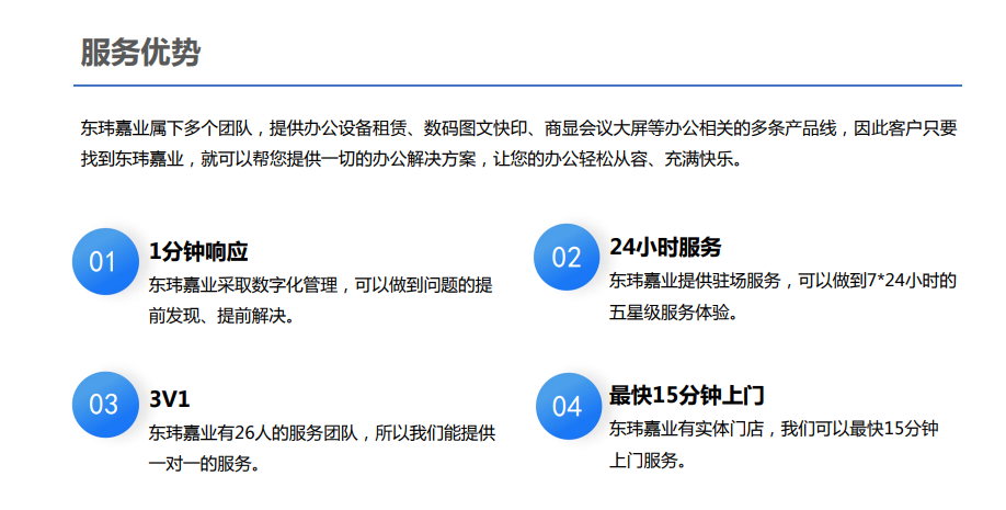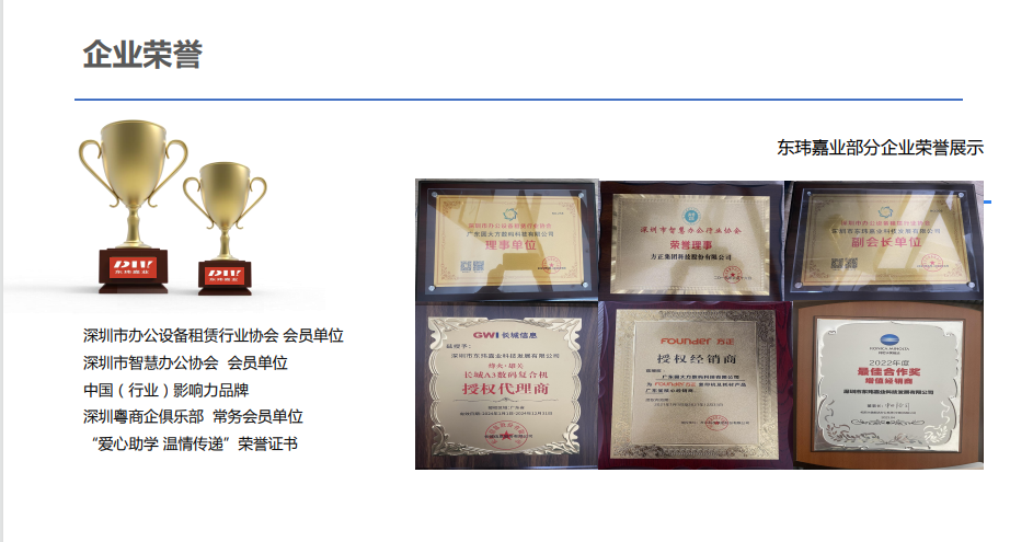 深圳市東瑋嘉業科技發展有限機構2015年成立,自創始敗興東瑋嘉業人便立志高遠持續超越自我,年營銷 額連創佳績,并先后得到“廣東省政府采購協議供應商” 、 “深圳市政 府電商平臺“ 、“全國柯尼卡美能達代秀售后服務獎”等榮譽。東瑋就 以“為企業供給優秀、省心、一站式的服務”為原則,先后成立辦公設 備租賃事業部(復印機、打印機,文印處理方法)、數碼印刷事業部 (印刷、設計名片、標書、宣傳、藍圖等)、智能商顯事業部(智能會 議平板、純顯商場大屏、會議系統集成、納米黑板、拼接屏、宣傳機 等)。以為客戶創造價值為宗旨,并為之付出終身奮斗!2016年,為實現節約環保,方便快捷的辦公承諾,東瑋嘉業率先推出辦 公設備租賃,文印處理方法等服務。