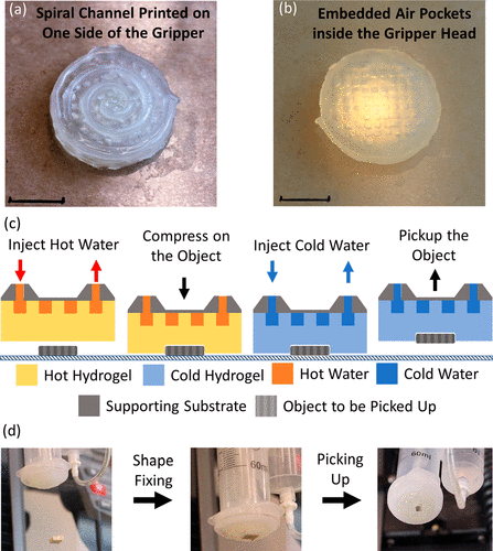 圖8. 3D打印的手抓器,可經過形狀記憶效應抓取任意幾何形狀的小物體。(a,b)3D打印的手抓器,在一邊帶有螺旋形通道,用于液體循環,而在另一邊帶有封閉的氣孔,易于變形。(c)形狀記憶手抓的工作過程。在抓取過程中,首要將熱水泵送經過螺旋通道以融化明膠網絡。同期,將加熱的凝膠壓在物體上,使抓握頭與物體的形狀相符。而后將冷水泵送經過螺旋通道,以冷卻水凝膠并固定其形狀,并用抓緊墊將物體包裹住。(d)在拾起塑料電連接器過程中3D打印的形狀記憶水凝膠手抓器的照片。比例尺為10毫米。