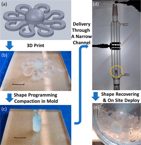 圖7. 3D打印的形狀記憶章魚,能夠被廣泛變形并壓實成圓柱形狀,以便于經過狹窄的管道傳送。(a)將經過SolidWorks創建的3D模型導入打印機。(b)3D打印的章魚的照片。(c)章魚變形并固定在緊湊的章魚卷中。(d)章魚面包卷經過一條狹窄的管子傳送,原來的章魚太大,沒法經過。(e)章魚在溫水浴中加熱后恢復其原始形狀。比例尺為10毫米。